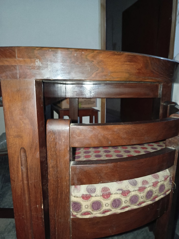 this dining was made with tali wood and contains double glass. The lower part has a mirror and the upper part has glass and is polished about 1 inch and the mirror is 12mm.it is termite free. You can add cars or any other decorations stuff in between both mirror and glass. Lastly it is in new.